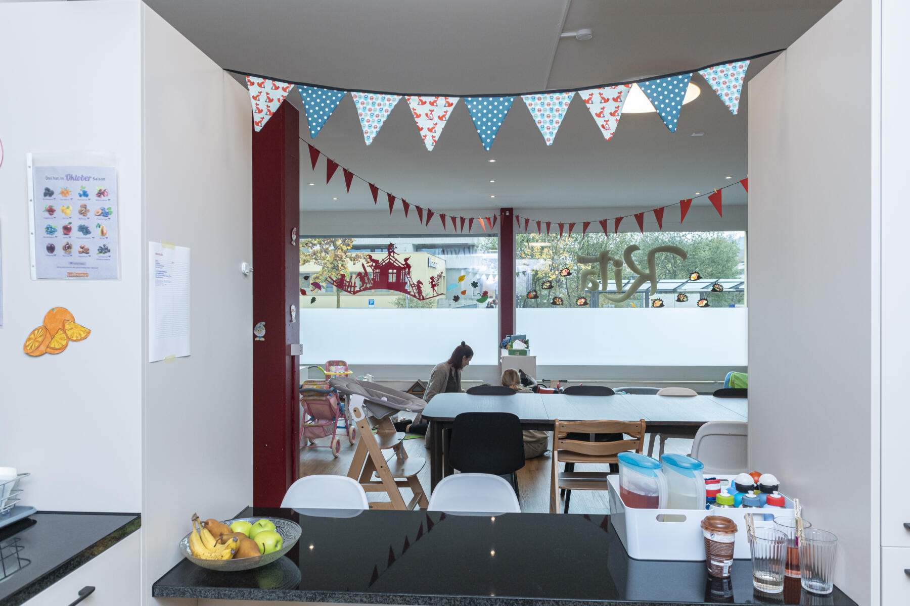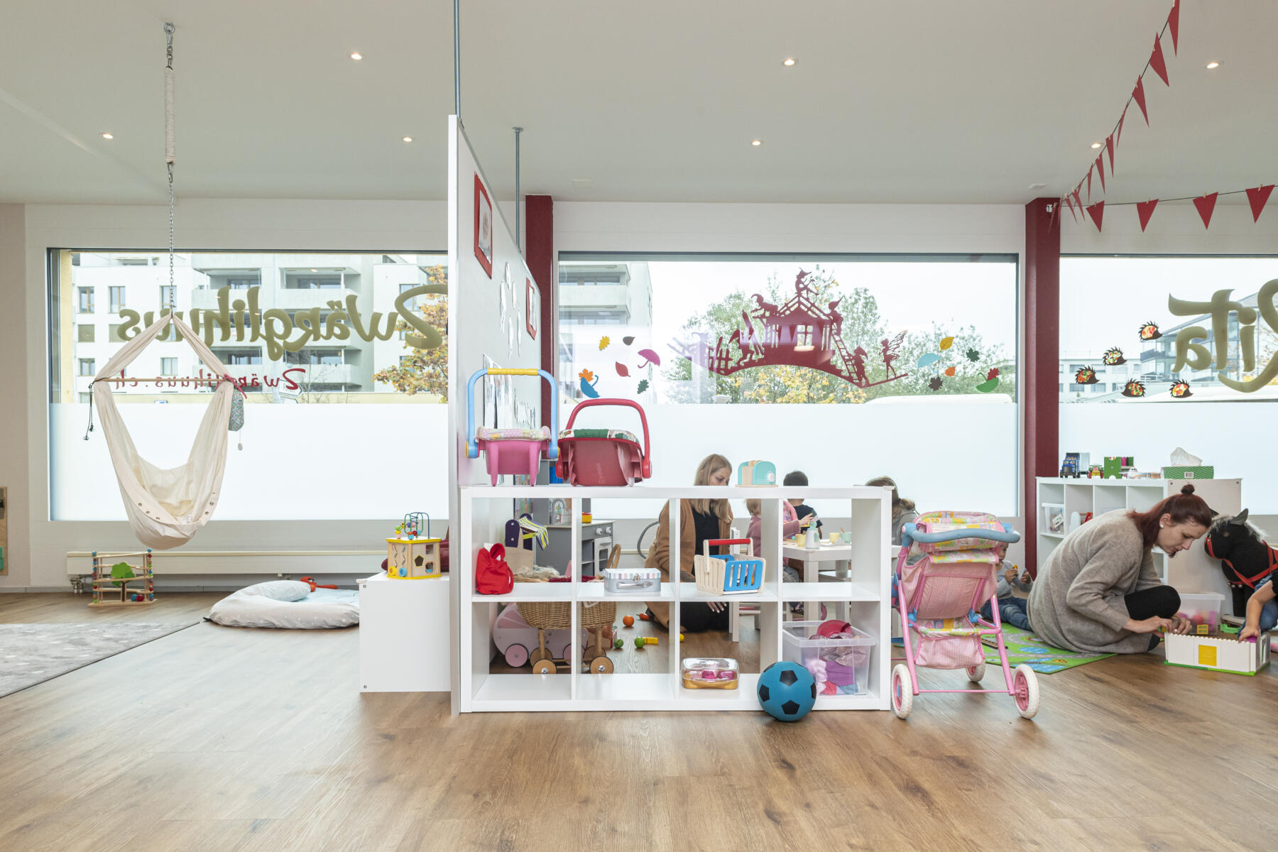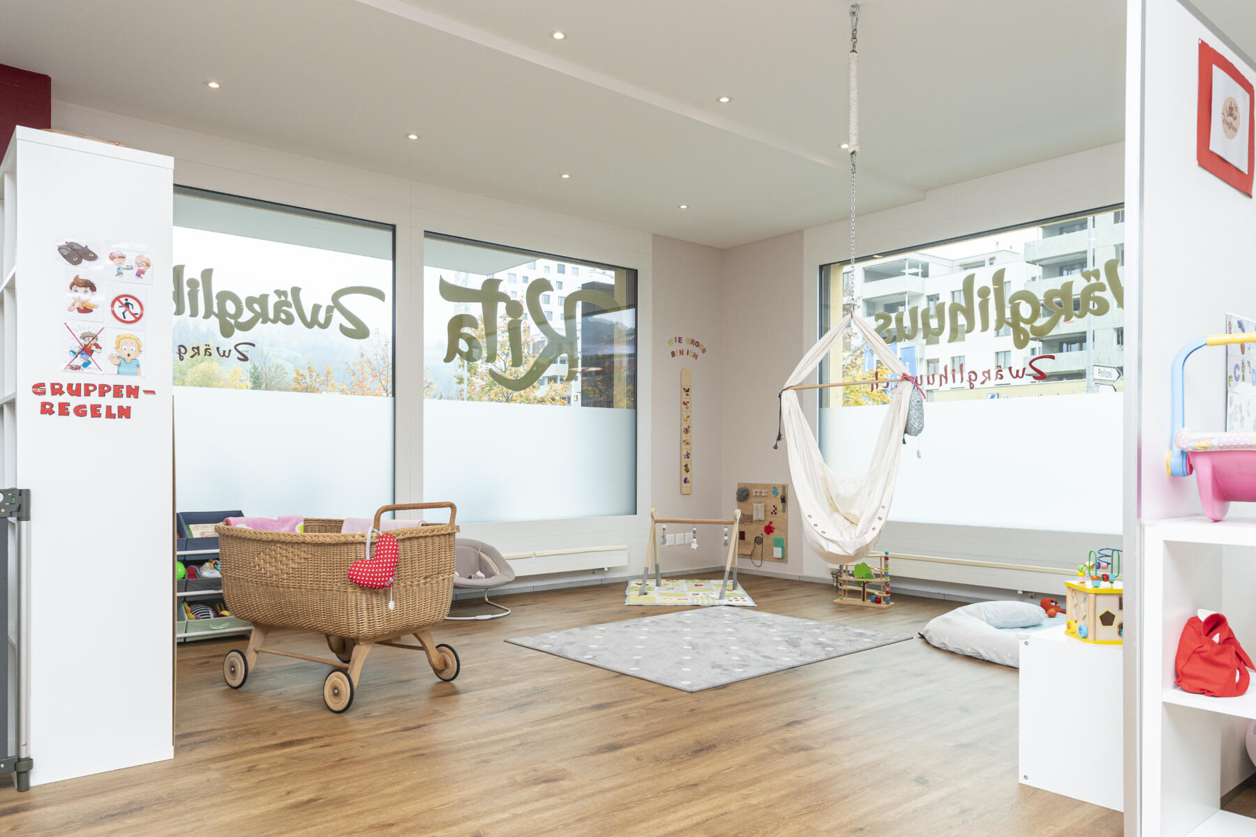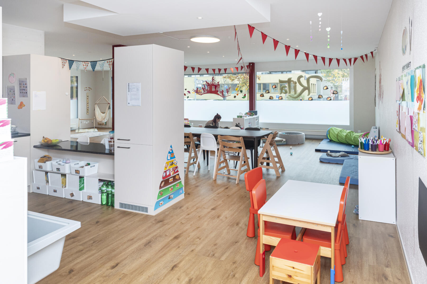 Der See ist ebenfalls in der Nähe. Zu Fuss ist man schnell auf der Allmend mit einem Wald und mit Naturschutzzonen. Unsere Räume sind offen, liebevoll und für die Entwicklung des Kindes anregend gestaltet.
